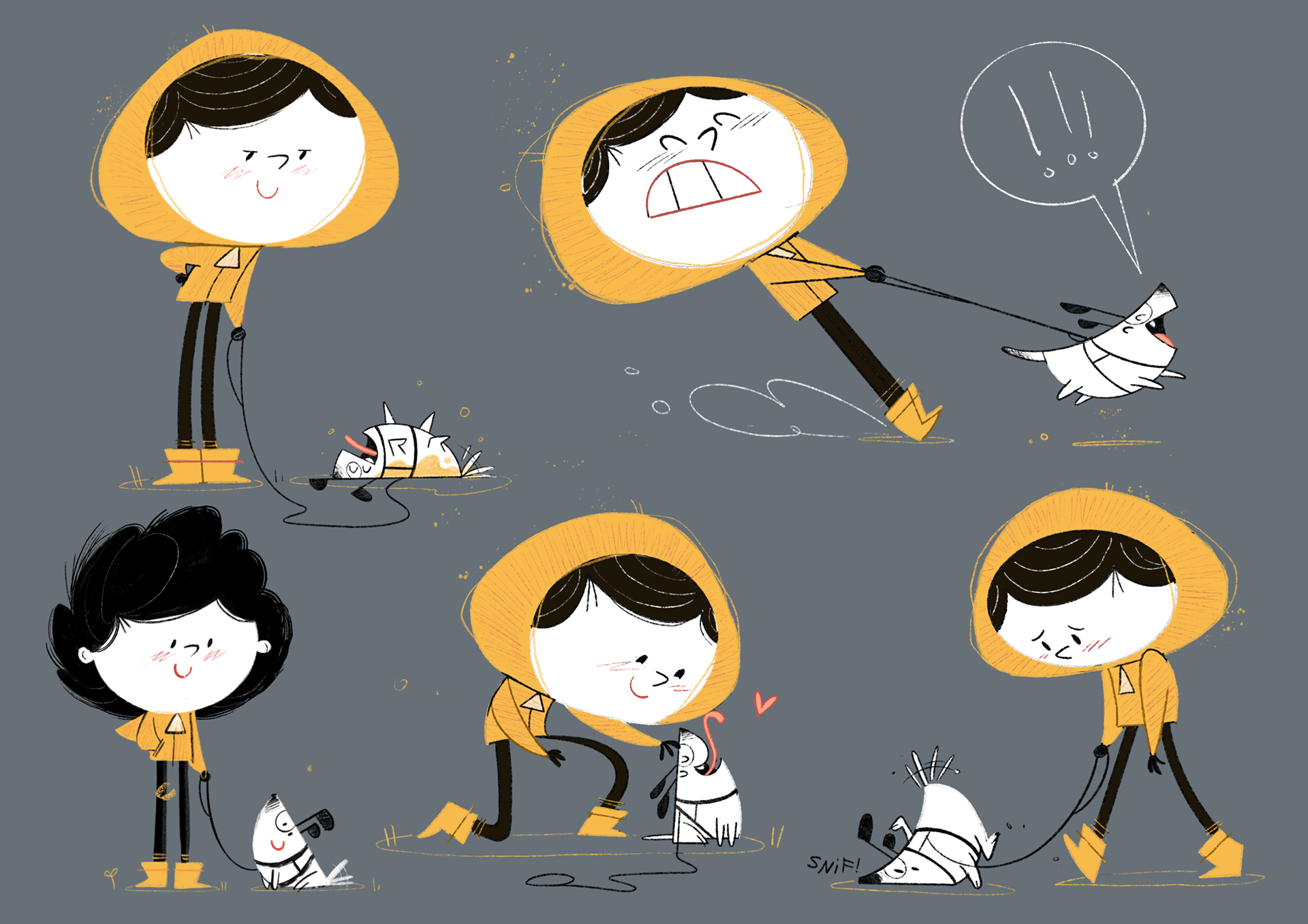 On a gloomy, dripping, rain-boots-required kind of day, Kid is ready to stay inside, warm and dry, and play video games. But to Dog, Kid’s arrival home means only one thing: it’s time for WALKIES! Outside, rain means puddles to splash in, mud to splock in! Tiny ears perked up, tail a-waggling with joy, Dog bounds through the park, Kid in tow.